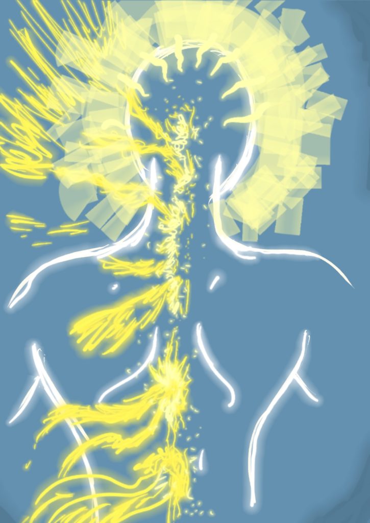 Ja to odczuwam jakby pulsujący, kochający złoty eter był wpompowany bezpośrednio do kręgosłupa na różnych odcinkach. Głowa nie ma już standardowej czakry korony, jakby instrument i przepływ stały się jednym, i czuję jakby złota, pełna miłości aureola pulsowała i wibrowała mi w mózgu, głaskała moją świadomością, ale z przestrzeni potencjałów – interpretuję to jako nowa jakość relacji z „wyższym ja”, które jest przecież nami samymi właśnie z tego pola maksymalnego potencjału.
